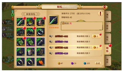 品质高于紫色的装备均支持精炼操作,精炼能够提升装备的部分属性,而精炼所需的精炼石可通过分解同等品质的装备来获取。
