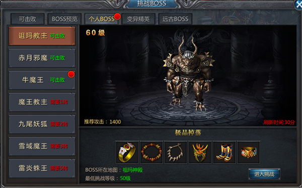 5、击杀相应BOSS达到指定数量会召唤远古boss,远古boss必定会掉落高级装备!