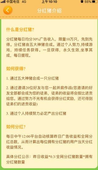 分红猪每日均分30%广告收入,限量10万只,先到先得。分红猪由五大神猪合成。通过个人努力,持续游戏,持续任务获得。一旦获得,永久生效,坐享其成,每日提现。
