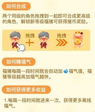 答:两个同级的角色拖拽到一起即可合成更高级的角色,解锁新等级福福猪可获得猪币奖励。