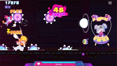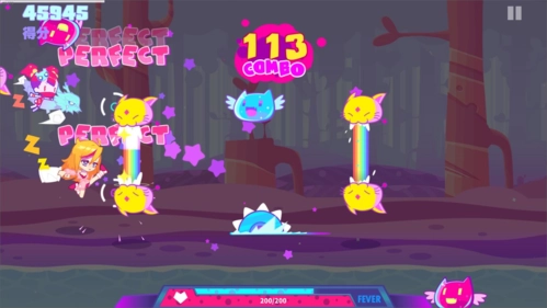 游戏中玩家将从位三名主角中挑选一位自己喜欢的人物进行游戏,在不断的向前奔跑的过程中,会出现各种道具和障碍物,你需要及时按下相应的按键来躲避和敲打它们,当玩家通过自己非常快速的手速和反应力来越过障碍物后,就能获得游戏的胜利了。玩家在游戏中能够体会到动作和音乐的完美结合带来的无限乐趣,节奏感非常的强烈刺激,中包含40首基础歌曲,以及13种扩充曲包,每个曲包都包含6首歌曲,携手凛、布若、玛莉嘉三位主角,12款独具特色的不同职业小姐姐,伴随着音乐的节奏,拳打BOSS,触发COMBO,顺应符音开始全新的冒险旅程。同时该游戏的玩法也非常的丰富,以音乐、收集、跑酷、闯关四大玩法为主,还加入了萌宠、换装、成就等多种元素,让游戏更具有趣味性,搭配上绚丽的攻击特效和节奏感的击打效果,可以让玩家更加沉浸于游戏之中。