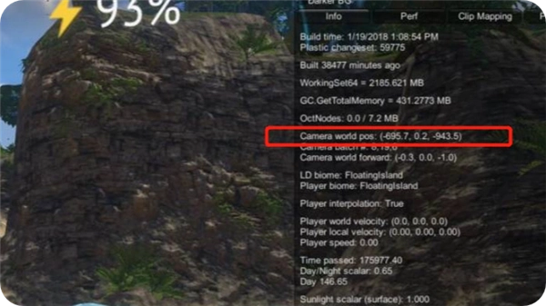 3、我们能在附近看到绿岛的底部,按下F1键就能查看当前坐标,然后朝着(-695.7,0.2,-943.5)这个位置移动,就能找到登岛的入口了。