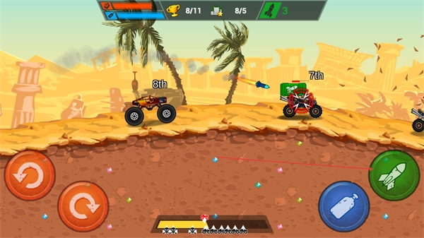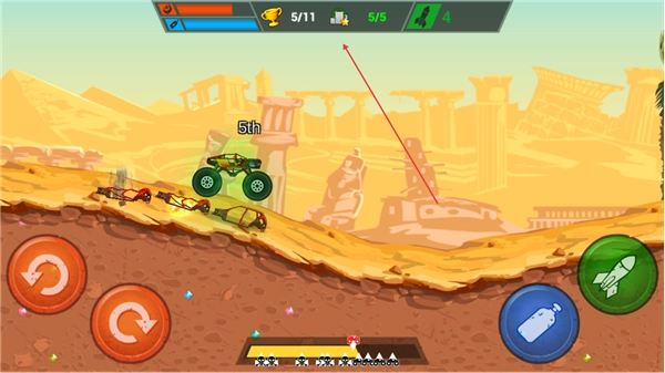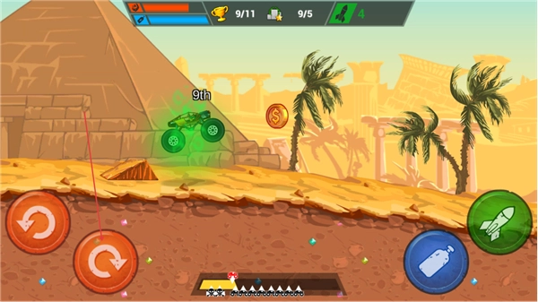 卡车自动行驶,左手通过操控前后翻滚键来调整车身姿态,右手负责掌控喷气键和发射键,仅需简单的两键操作就能完成特技飞跃与道具攻击,新手可以快速上手。