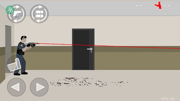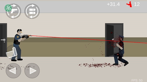 3、操作方向有左和右两种选择,界面左上角是换枪和换子弹的功能区,右下角则是一个保命技能键。当僵尸靠近时,你可以通过踢腿动作将其踢倒或逼退,这个技能最多能同时对两个僵尸生效,熟练运用它能让游戏过程轻松不少。另外要说明的是,游戏里射击僵尸腿部每次可得2块钱,射击身体每次5块钱,射击头部每次10块钱,这样的设定似乎没什么问题。