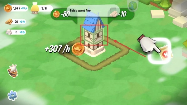 1、点击提示的位置,消耗【80】金币与【10】木材来搭建第二层楼,如此每小时可获取307的收益,能让小镇发展得更迅速呢。