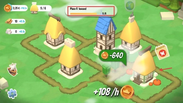 2、接下来需要达成【Place-6-houses】的目标,耗费【640】金币来建造房屋,每小时还可增加108的收益,这样就离目标又近了一步。