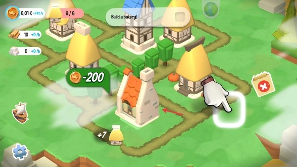 3、等房屋数量达到要求后,我们就能用【200】金币来建造【Build-a-bakery】,这样小镇不仅能新增面包房的功能,还能获得7的收益呢。