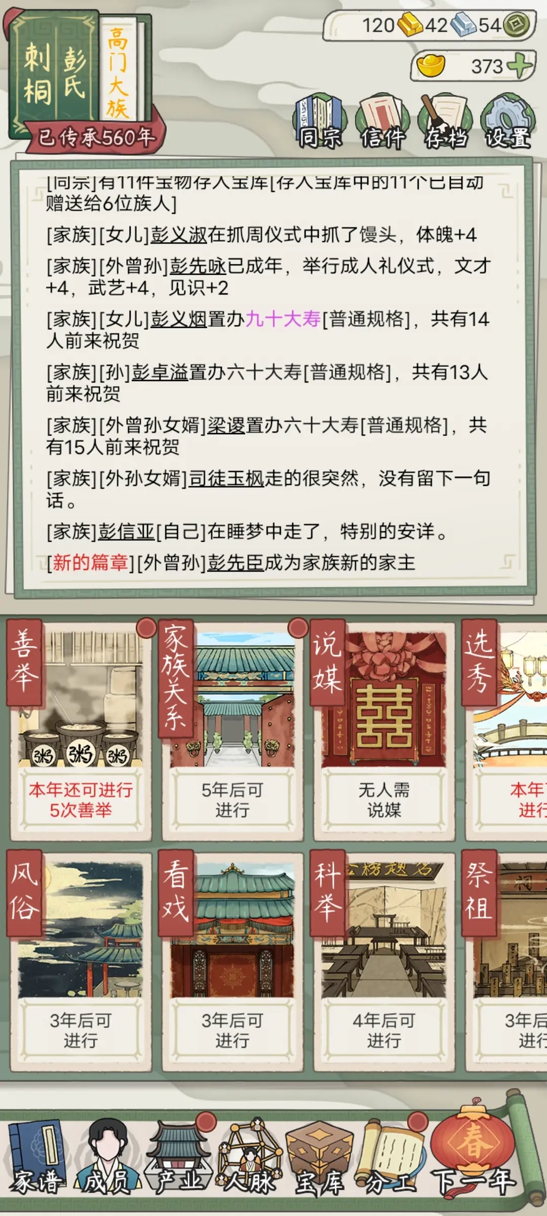 4.元宝不要随意使用,建议花在宴会和祭祖这两个地方。宴会优先选择豪华宴会,能增加更多属性;祭祖的话,2个元宝的选项比10个元宝的更划算,推荐选前者。