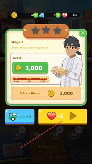 1、在Stage1中,目标是获取3000金币,点击按钮消耗爱心进入关卡,开始制作鸡肉粥。