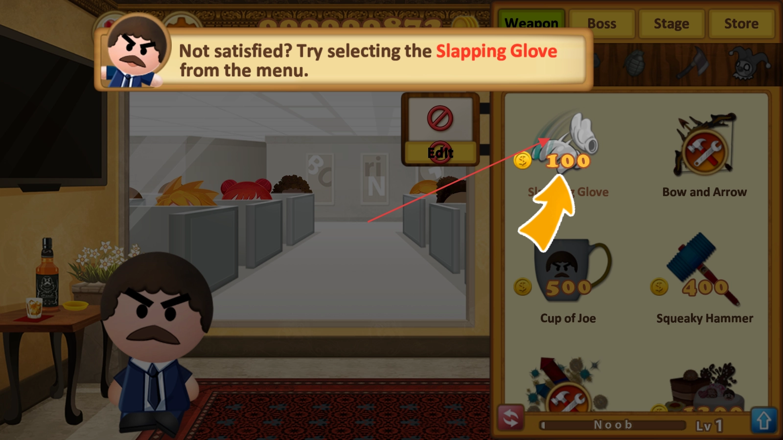 2、点击右侧武器栏,选择对应武器(如CupofJoe等),消耗金币解锁或装备,为攻击老板做准备。