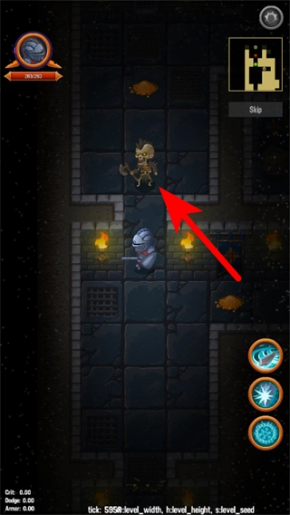 4、继续在迷宫中探索,移动英雄至新出现的骷髅敌人处,再次触发战斗推进关卡。