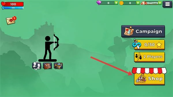 1、点击界面右侧的“Shop”按钮进入商店,可购买武器、道具等资源,为战斗做准备。