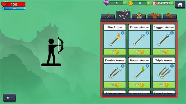 4、切换到箭矢分类,购买“FireArrow”(15金币)等特效箭矢,丰富攻击手段,增强战斗效果。