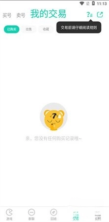 2、点击“交易”选项,页面上方会出现“买号”或“卖号”的选项。