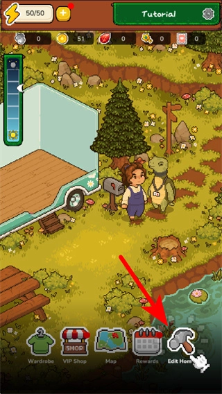 4、按箭头指引点击锤子的按钮,查看道具的相关的功能,借助该系统获取游戏资源以推进玩法进度。