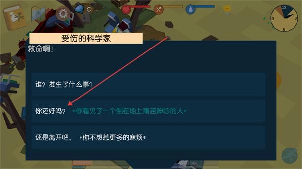 2、遇到受伤的科学家发出呼救后,在弹出的对话选项里选择对应内容,推进与该角色的互动流程。