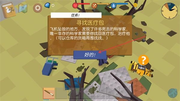 3、点击好的按钮接取任务1寻找医疗包后,依照提示前往仓库货箱周围区域,搜寻所需的医疗包道具来完成该任务。