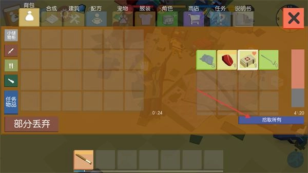 4、在背包界面中,找到右侧的拾取所有按钮并点击,可将当前可收集的物品全部收纳至背包中。