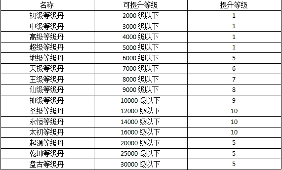 等级丹分为15个等级,不同等级丹对应提升如下。