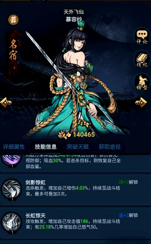 接下来看看我们的核心角色慕容纱,她具备吸血以及击杀敌人后回满生命值的能力,此外还拥有增加伤害、免疫控制和借助宝物复活等技能,详细效果请参考图片。