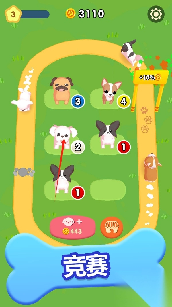 2、合成系统:借助观察、规划与操作来推进合成进程,巧妙运用狗狗的特性与技能组合;连续成功操作会触发狗狗狂欢,从而获取额外资源与奖励,以此灵活应对各类比赛挑战。