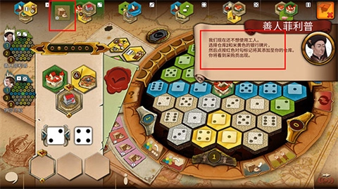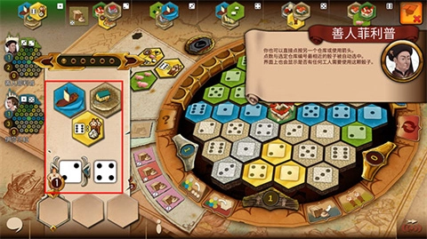 3、你也可以直接点击另一个仓库或使用箭头。点数与选定仓库编号最接近的骰子会被自动选中,界面上还会显示是否有工人需要使用这颗骰子。