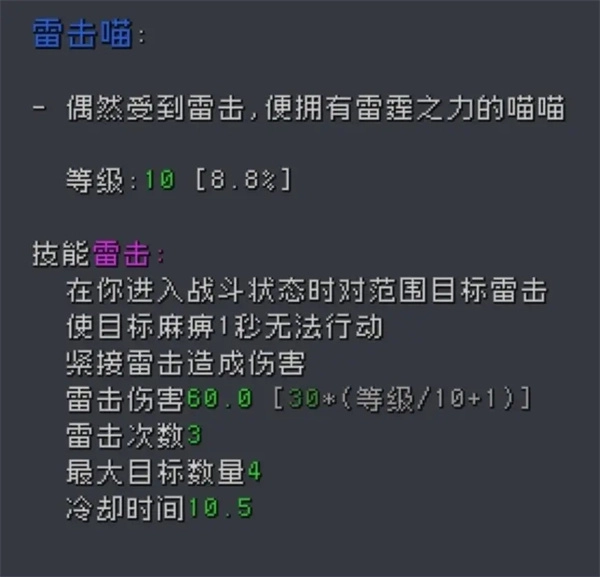 桃子现在只有蓝色品质,它能触发雷击攻击敌人,重点不是靠这个打伤害,而是能让敌人麻痹1秒,这样你就能少受几次攻击了。雷击喵可以用经验升级,那经验要怎么获取呢?
