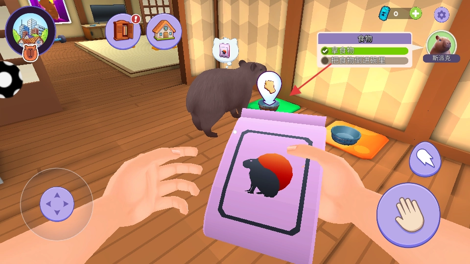 3、带食物袋找动物,将食物倒进碗里,完成喂食。