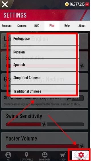 3. 找到下方的“设置”(settings),点击进入后选择“play”选项,接着点击“language”并向下滑动列表,找到“简体中文”选项来切换语言。