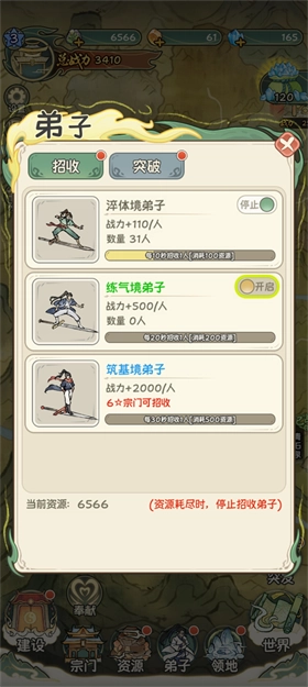 3、随着等级的提升,能招收的弟子也会越来越多。