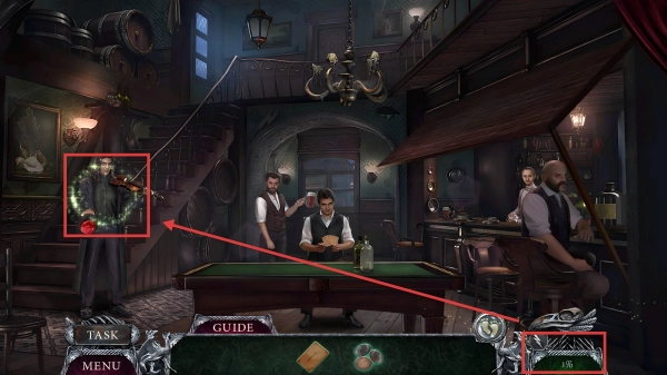 3、进入酒馆后,我们可以点击右侧的提示,按照指引再去点击小提琴手,这是获取新线索的关键突破口。