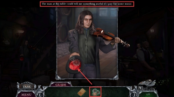 4、按照上面给出的提示,我们需要把【硬币】放进小提琴手的礼帽里,以此从他那里获取信息,推动后续的解谜步骤继续进行。