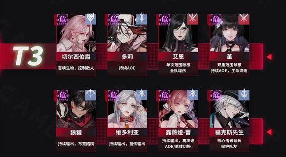 T3角色:切尔西伯爵、多莉、艾恩、堇、狼獾、维多利亚、露薇娅-蕾、福克斯先生