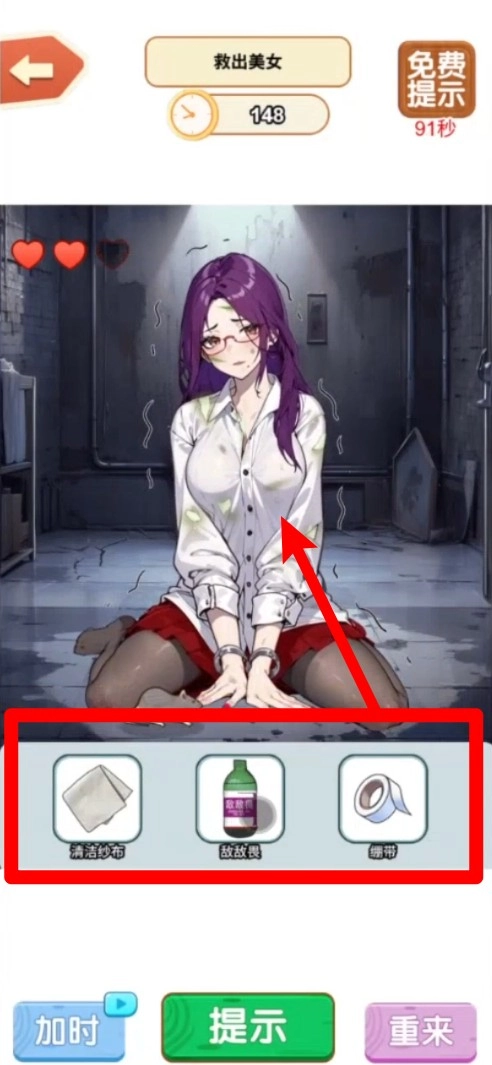 2.关卡挑战:按照提示挑选合适的工具来操作,借助清洁布、胶带或者救助药这类道具,助力角色圆满达成关卡任务。