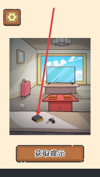 2、进入室内场景后,注意观察粉色行李箱、桌上的救生衣、电视以及窗户,要仔细查看并尝试与之互动,以便获取有用信息。