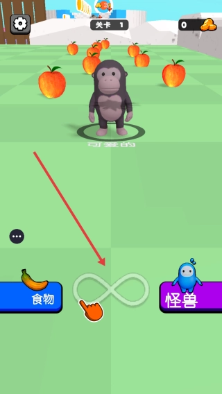 1、关卡初始界面设有食物、怪兽等选择按钮,玩家可根据游戏提示与自身需求,点击对应的按钮来确定角色的行动方向,从而开启不同的游戏进程。