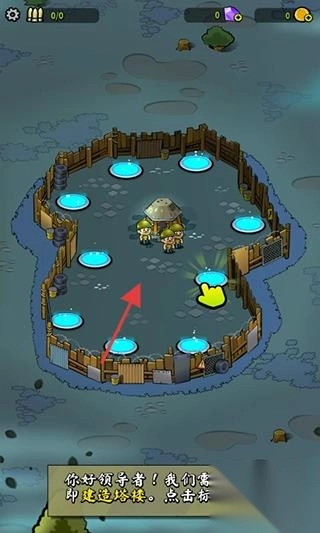 3、依据提示(建造塔楼),点击标记好的位置,消耗资源来建造建筑,以此强化营地的防御能力,从而推进关卡进度。