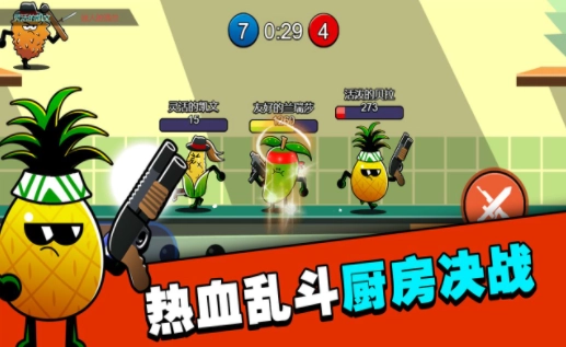 2、无厘头对战体验:西瓜护盾反弹、菠萝冲锋等技能组合打破传统规则,战场随时可能上演逆风翻盘。