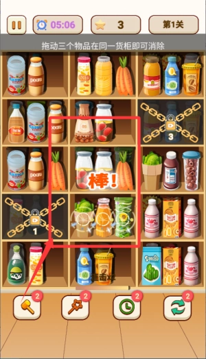 1、开始游戏时先观察货柜的布局,优先移动边缘位置的物品来开辟更多空位。对每一步操作进行合理规划,尽可能一次性消除多个相同物品以提升效率。