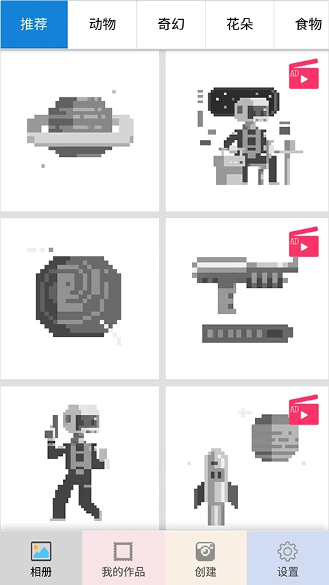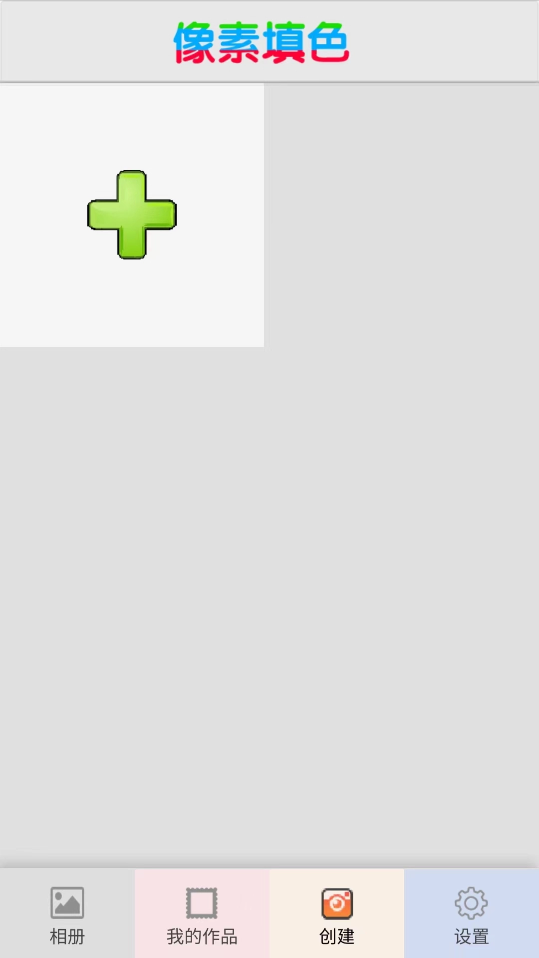 1、启动像素填色涂鸦大师后,能看到包含【相册】、【我的作品】、【创建】与【设置】在内的四个频道。