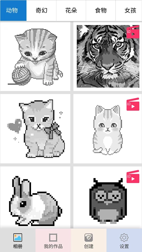 2、进入相册界面,这里有动物、奇幻、花朵、食物、女孩等多种丰富分类可供玩家自由挑选,下面就以【动物】分类为例进行说明。