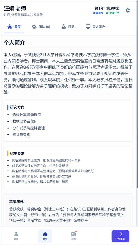 5、点击主页,可查看个人简介、学术研究方向、招生要求,以及主要成就;