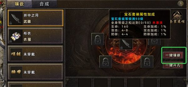 可以给武器和服装镶嵌宝石,当宝石套装达到满级时,就能激活相应的属性加成效果。