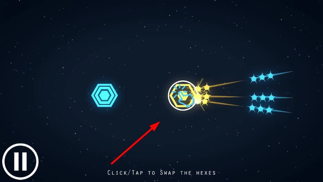 1、留意六边形的初始排列方式以及其周围光点的色彩,通过调换六边形的位置,使相同颜色的六边形与袭来的光点精准对齐。