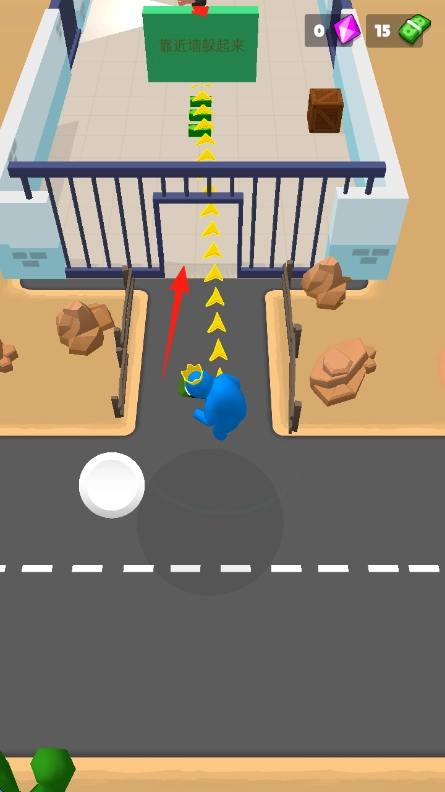 进入游戏后,在界面上操控蓝色角色,按照黄色箭头的指示,朝着绿色标识旁靠墙隐蔽的位置移动。