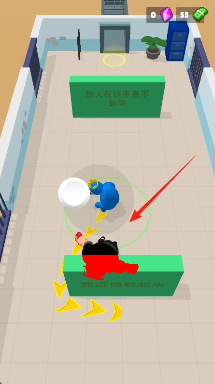 2、在行进过程中,若遇到敌人黑衣角色,按照提示躲到绿色墙体后方——敌人无法在此处看到你,这样就能避免被发现。
