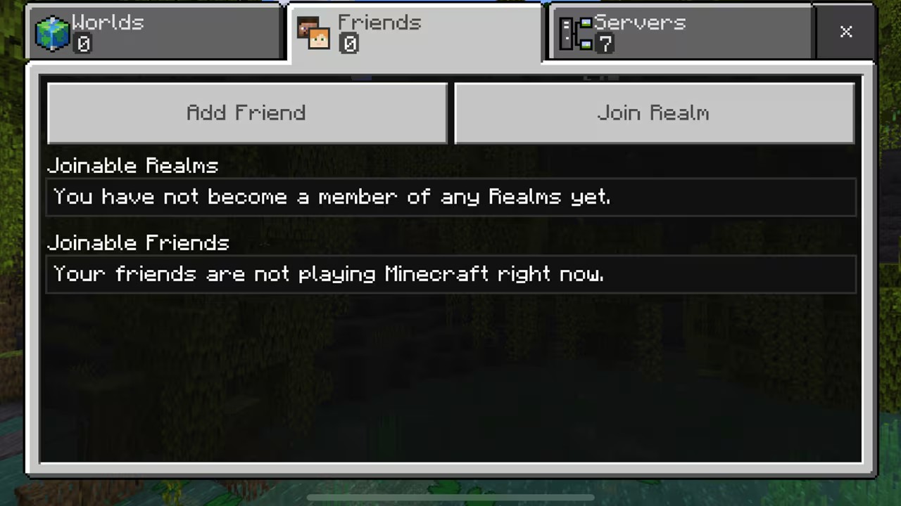 如果您想要和朋友一起游玩,请单击“好友”选项卡。您将被定向至一个界面,该界面上会显示您所属的Realms 以及当前正在游玩 Minecraft 的好友。要添加好友,请询问好友的玩家代号,然后单击“添加好友”按钮。输入玩家代号,按下 Enter 搜索玩家,然后您就可以添加好友了。