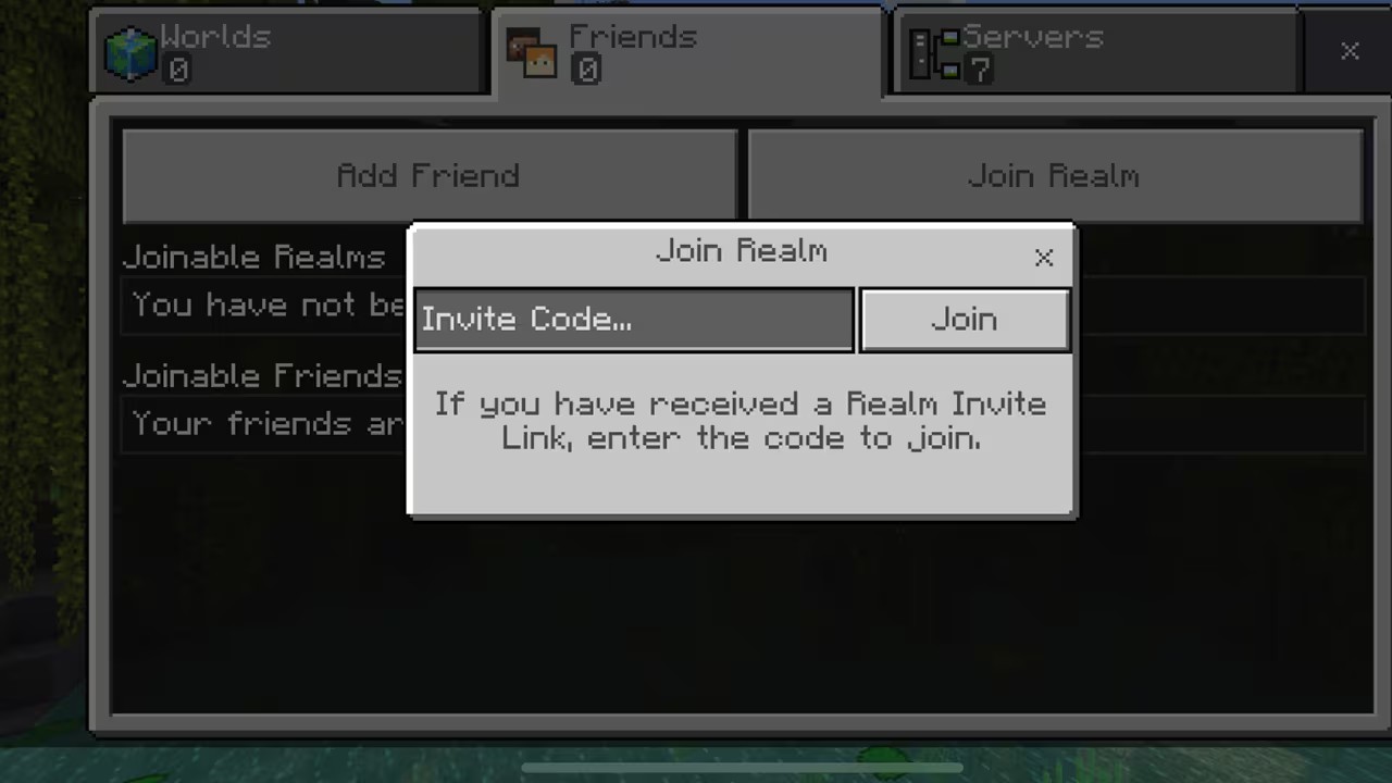 如果您的一位朋友订阅了 Minecraft Realms,并且您想要与他们一起畅玩,您也可以通过此界面加入他们的 Realm。请询问好友以获取 Realm 邀请码,接着单击“加入 Realm”按钮,然后输入邀请码。这会将 Realm 添加到您的好友列表中,以便您随时加入。
