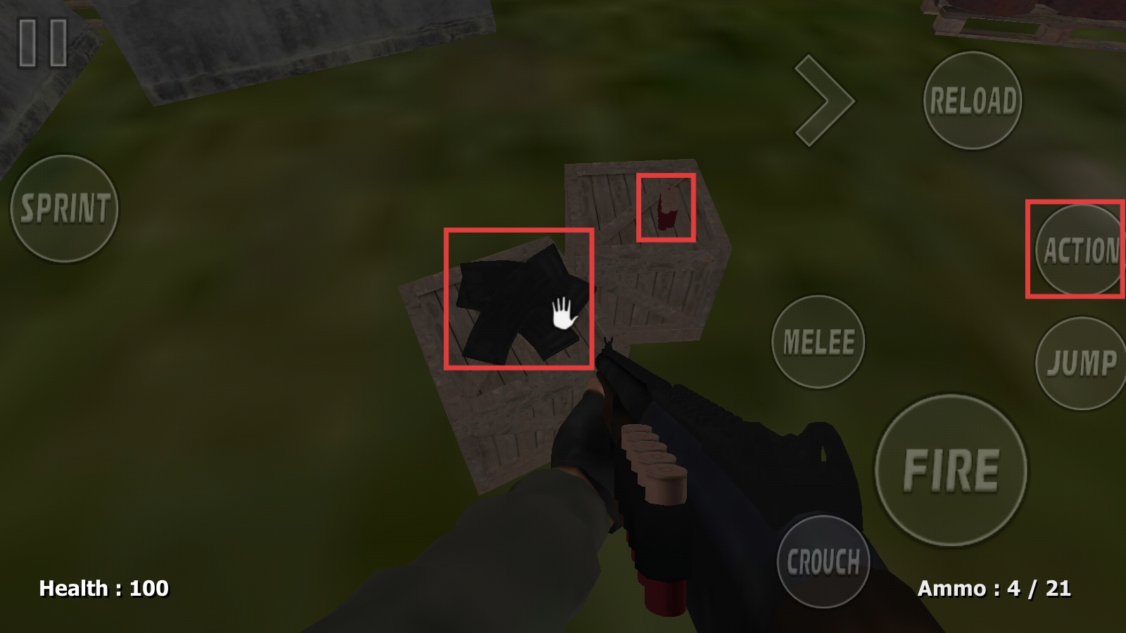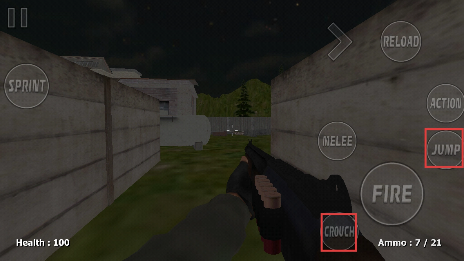 2、遇到敌人时,先瞄准然后点击【FIRE】键进行射击;当子弹数量不足时,点击【RELOAD】键完成装弹;若是近距离作战,还能使用【MELEE】键将敌人击倒。