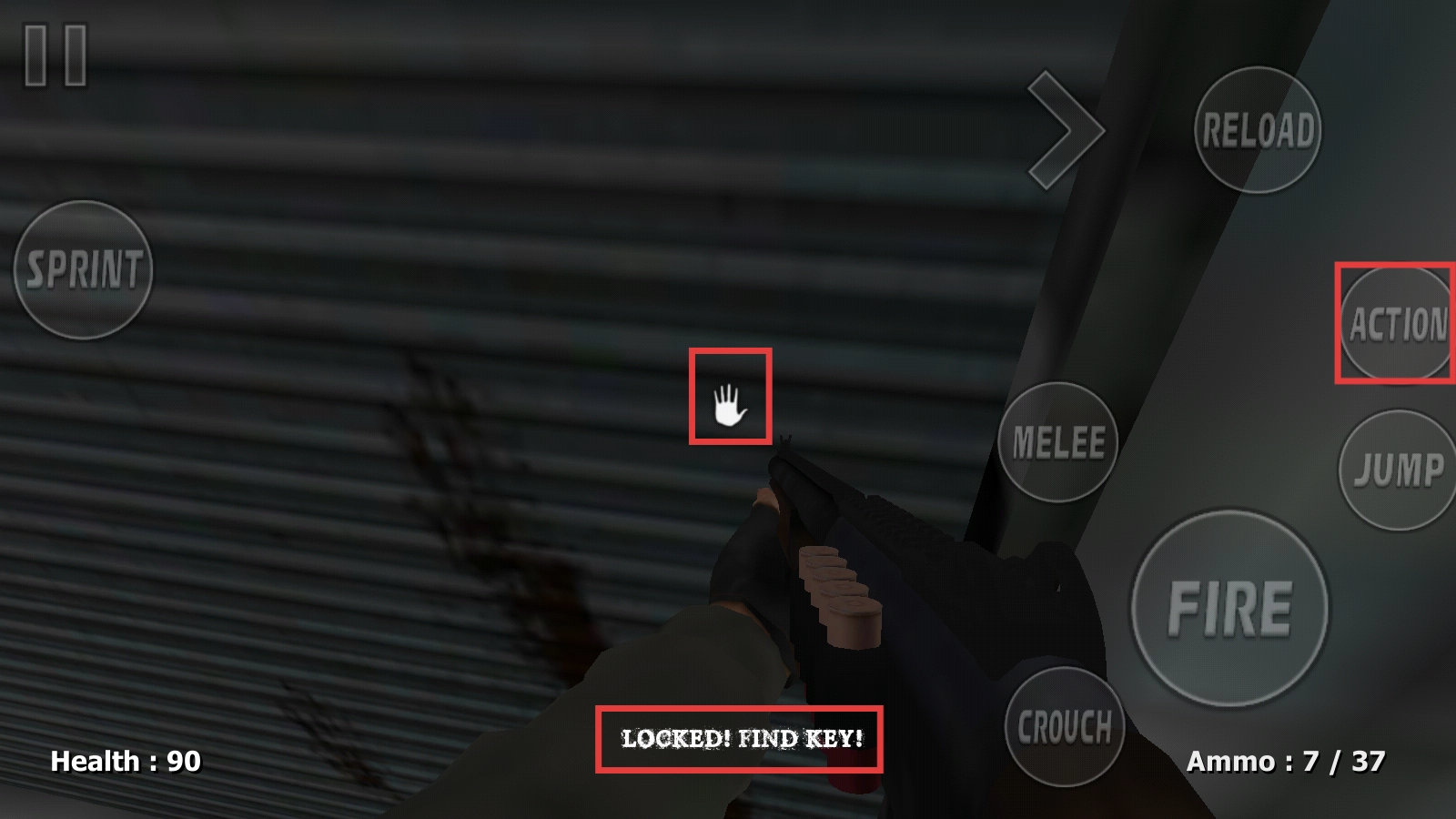 4、碰到锁着的门时,界面会提示我们去寻找钥匙,找到钥匙后点击【ACTION】就能进入新区域,继续探索这个阴森恐怖的地方,努力存活下去吧。
